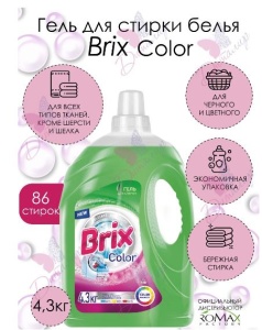 ОписаниеROMAX Гель для стирки белья, "BRIX", Universal, 4,3кг. для стирки черного белья, цветного, белого. Жидкое средство глубоко проникает в волокна тканей, отстирывая даже сложные пятна. Отлично выполаскивается, не оставляя разводов на одежде. Подходит как универсальное средство для отстирывания пуховиков, спортивной и мембранной одежды. Жидкий стиральный порошок сохраняет яркость цветного белья, глубину темных оттенков черного белья, устраняет желтизну и серость белого белья. Стиральное средство Брикс для цветного белья предназначено для ручной и автоматической стирки цветных изделий из различного типа тканей, кроме изделий из шерсти и шёлка. При машинной стирке непосредственно наливать в бак стиральной машины или специальный контейнер. Такая бытовая химия незаменима в каждой семье как товары для дома. Концентрированный гель экономичный, чем выгодно отличается от капсул, таблеток и пластин. Состав Color вода;5-15 %: анионные ПАВ, ˂5 %: неионогенные ПАВ, амфотерные ПАВ, хлорид натрия, отдушка, цветосберегающий комплекс, комплексообразователь (соль ЭДТА), пеногаситель, консервант, краситель.