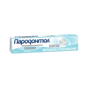 ОписаниеЗубная паста "Пародонтол" БЕРЕЖНОЕ ОТБЕЛИВАНИЕ Предназначена для поддержания естественной белизны зубов, укрепления эмали и защиты от кариеса. Специально подобранный уникальный комплекс активных компонентов: способствует сохранению естественной белизны зубной эмали защищает от образования зубного камня заботится о здоровье десен укрепляет эмаль и защищает от кариеса Активный фтор препятствует образованию кариеса, укрепляет зубную эмаль, обеспечивает защиту от «сахарных кислот». Экстракт лайма – способствует поддержанию здоровья десен. Не содержит: SLES, ТРИКЛОЗАН, ХЛОРГЕКСИДИН, САХАР Состав: Состав: вода, глицерин, диоксид кремния, лаурилсульфат натрия, пирофосфат натрия, натрий карбоксиметилцеллюлоза, отдушка, пирофосфат калия, поливинилпирролидон, экстракт лайма, фторид натрия, натрия сахарин, диоксид титана, метилпарабен.